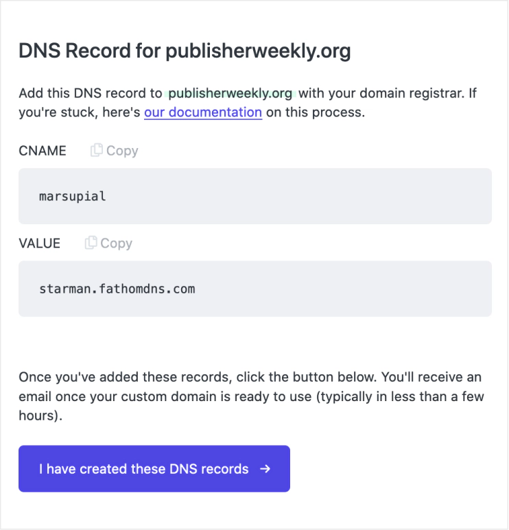 To do this, head to Domains in your Fathom Analytics account and enter your custom domain. You’ll be given some DNS records: