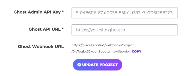 Within the integration, you will see an Admin API Key and an API URL. Copy them into the Placid project settings.