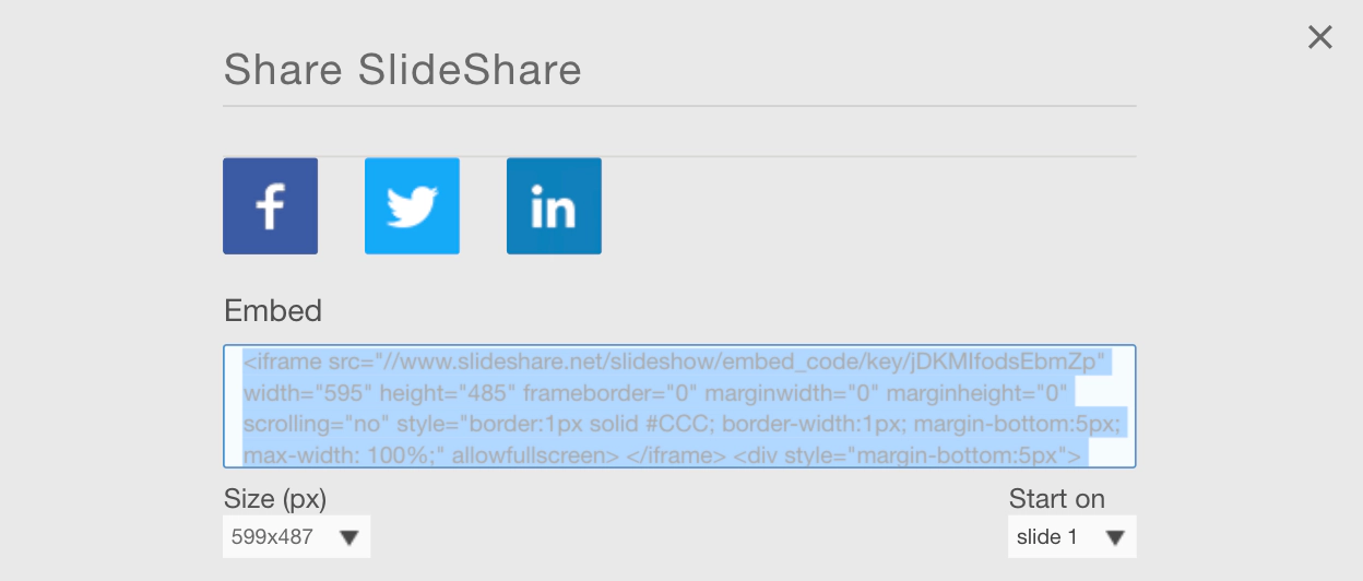 Once your slides are ready to share, open up the share menu from the SlideShare page and copy the HTML embed code: