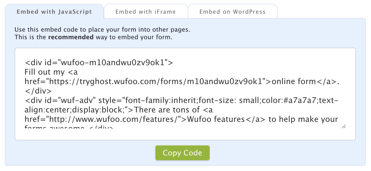 Next, copy the provided JavaScript embed code from the share page to your clipboard.